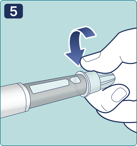 9. Sujetando la pluma jeringa apuntando la aguja hacia arriba, presione el botón de dosis y manténgalo en esta posición
